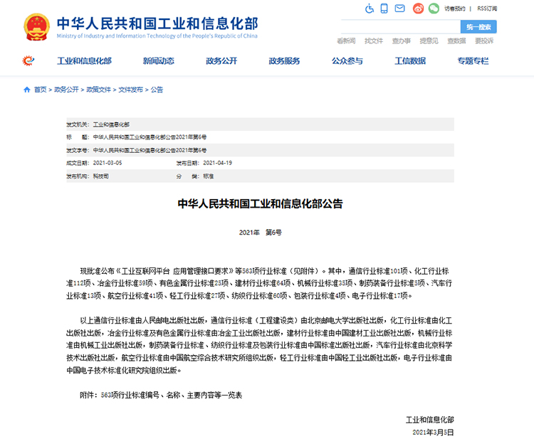 中华人民共和国工业和信息化部公告及563项行业标准编号、名称、主要内容等一览表(文章来源网址:https://www.miit.gov.cn/zwgk/zcwj/wjfb/gg/art/2021/art_3ad89e3a12934c59945f6544361c3565.html)
