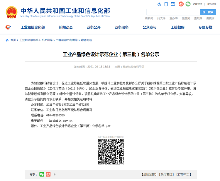 图:国家工信部公示第三批工业产品绿色设计示范企业名单