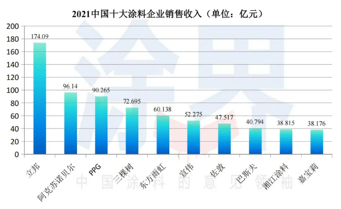 榜单显示,立邦以174.09亿元销售收入蝉联榜首,这也是立邦连续七年位居榜首。阿克苏诺贝尔、PPG去年在华销售收入均同比下跌,分别以96.140亿元、90.265亿元的销售收入位居榜单第二、三位,其中阿克苏诺贝尔排名较往年上升1位,而PPG排名较往年则下降1位。