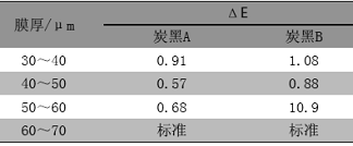 表 5 不同膜厚条件下,炭黑颜料对粉末涂料色差的影响