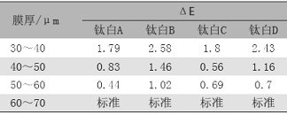 由表 3 和图 1 可看出, 4 种钛白粉的变化趋势一致,都是随着膜厚的减少色差越来越大,但是色差增加的幅度不同,说明不同的钛白粉其遮盖力是有差别的。从变化趋势上看,可认为遮盖力 B<D<A<C 。由此可知,实际生产中应该考虑钛白粉的遮盖情况,酌情选择钛白粉以节省成本,特别是薄涂产品更应该考虑使用遮盖力好的钛白粉以便达到薄涂遮盖的目的。
