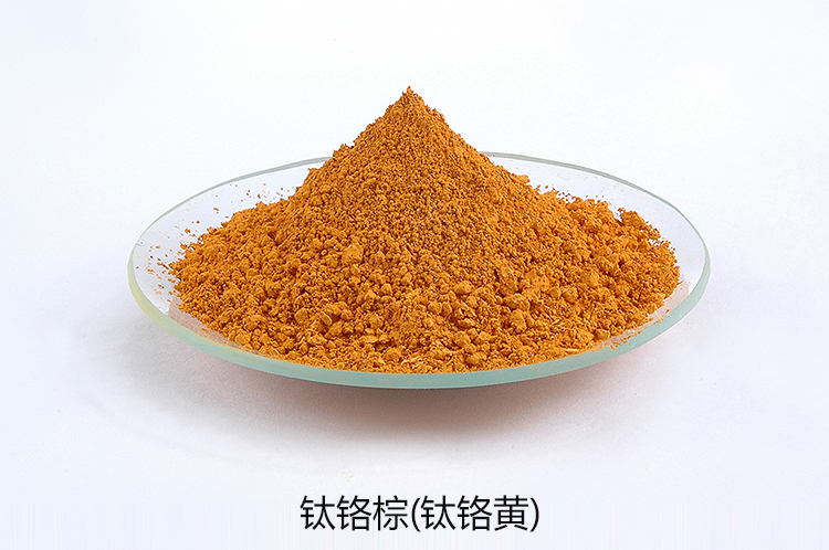 钛铬黄:又名镍锑钛棕;钛铬棕,红光钛黄,国际染料索引号为颜料棕24/P.Br.24(71310),其色谱从正黄直至红光黄。钛铬棕易分散,具有良好的遮盖力,优异的耐光、耐候、耐热稳定性,耐化学品性,无渗色和迁移,兼有优异的红外反射功能。