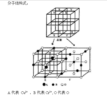 具有这种特性晶格的金属氧化物由金属氧化物,碳酸盐,硝酸盐,或氢氧化物混合后经750~C以上高温煅烧、反应,原料中具有3d电子的金属离子和氧离子重新排列,在各种助剂作用下,形成更稳定的尖晶石(Spine1)结构,参见图4,在O2-结构中形成立方密堆积,Cr3+(B)占有1/2八面体空隙,Cu2+(A)占有l/8四面体空隙。